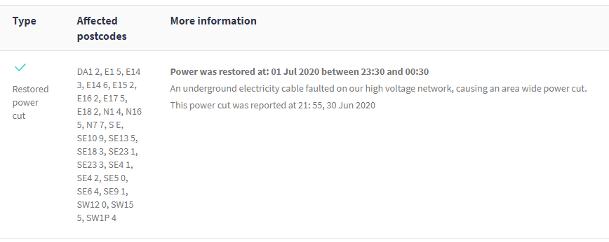 There appeared to be a power cut as I drove home tonight No street lights and all houses dimmed. All houses on Honor Oak Rise were dark.