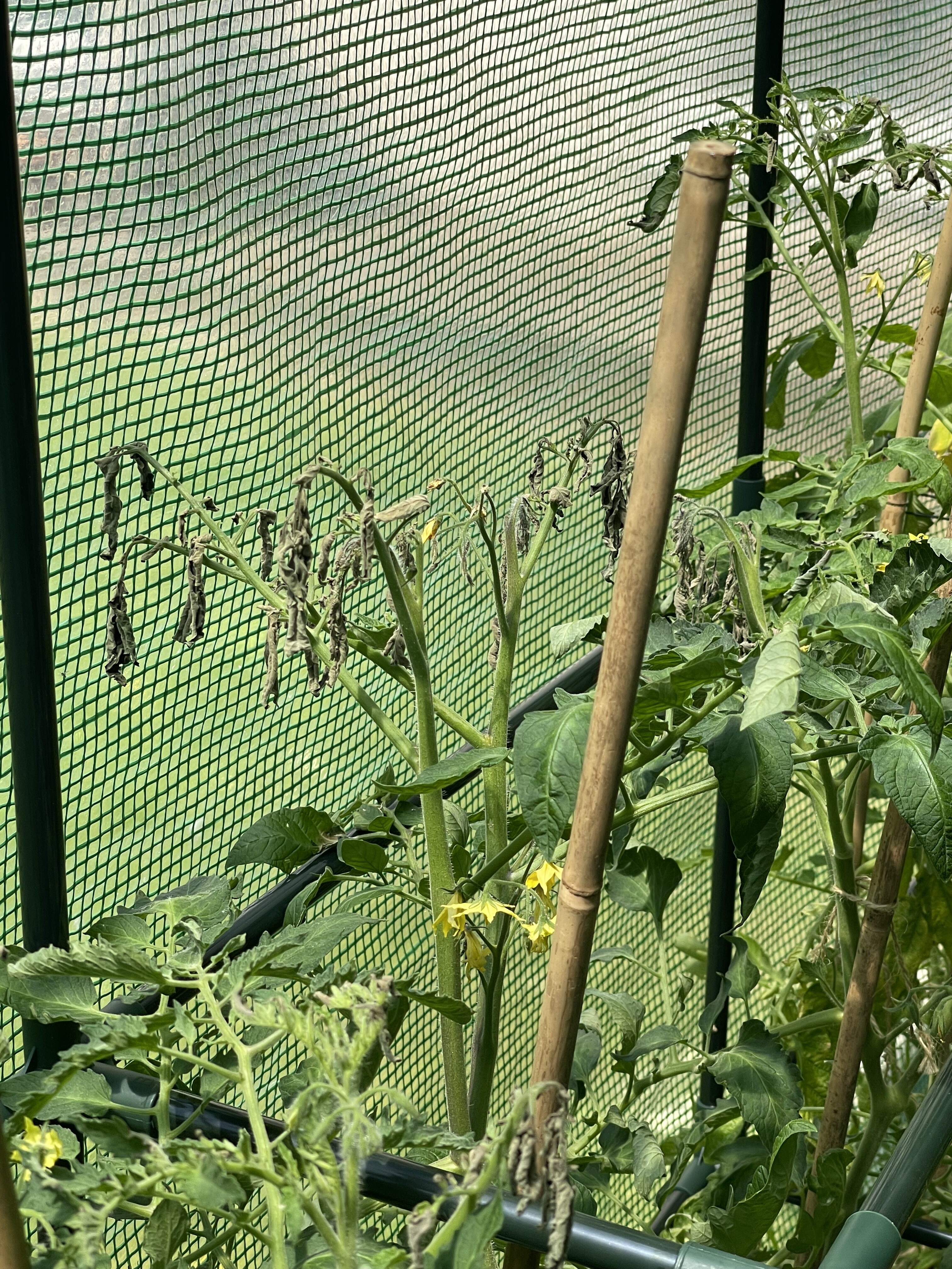 Some advice would be very welcome. I’m a first time greenhouse tomato grower. My plants (all grown from seed over the spring) are mostly doing well but the tops of a couple are looking a bit fried.