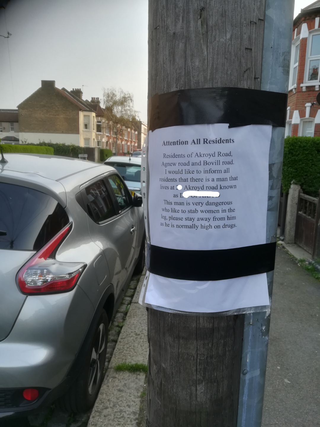 For anyone reading this it was a photo of a sign that referred to a man who allegedly who liked to stab women when on drugs, and gave his alleged address on Bovill Road.