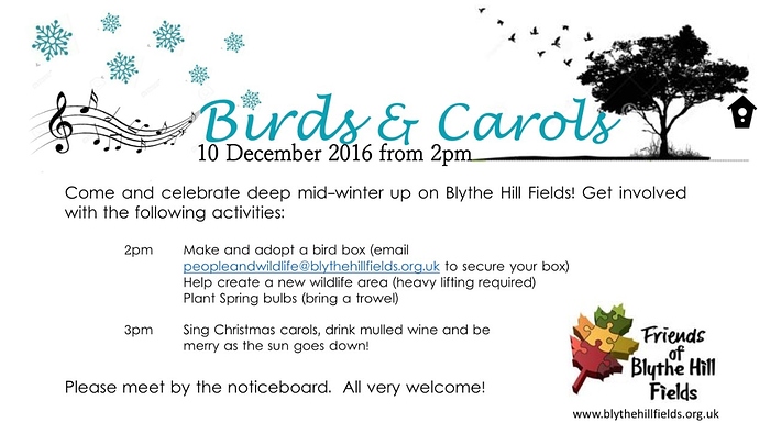 You are welcome to celebrate the deep mid-winter on Blythe Hill Fields on December 10th, from 2pm until sunset. We’ll be creating a new wildlife area using the logs from the recently felled trees, planting bulbs and we’ll be singing carols, drinking mulled wine and eating mince pies.