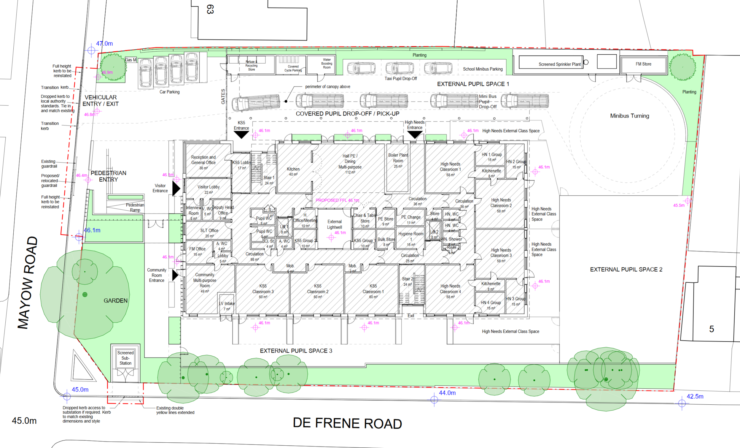 The construction of a two-storey school building and single storey ancillary buildings to provide a satellite site for the expansion of Greenvale Special Educational Needs Secondary School, being D1 (educational) floorspace including a staff terrace, with roof-level plant and photo-voltaic panels, together with associated provision of a sub-station, sprinkler plant enclosure, pedestrian and vehicle access arrangements with canopy cover, vehicle parking, cycle parking, external play space, hard and soft landscaping, and associated ancillary works at the former Brent Knoll School, Mayow Road, SE23.