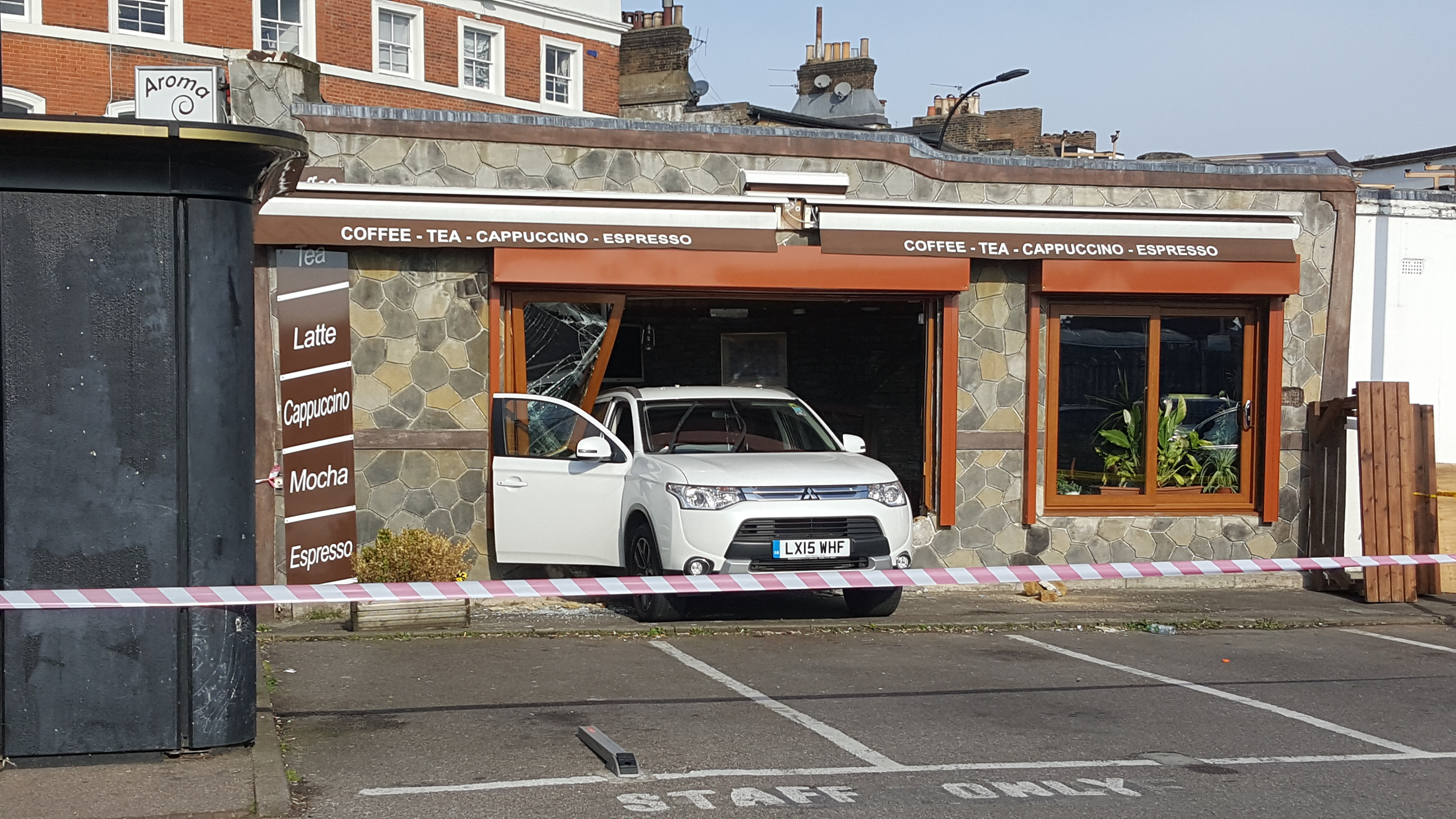 Looks as if vehicle crashed through wall of cafe at Forest Hill station. Area cordoned off with tape but only stunned commuters in attendance.