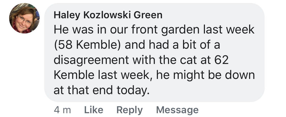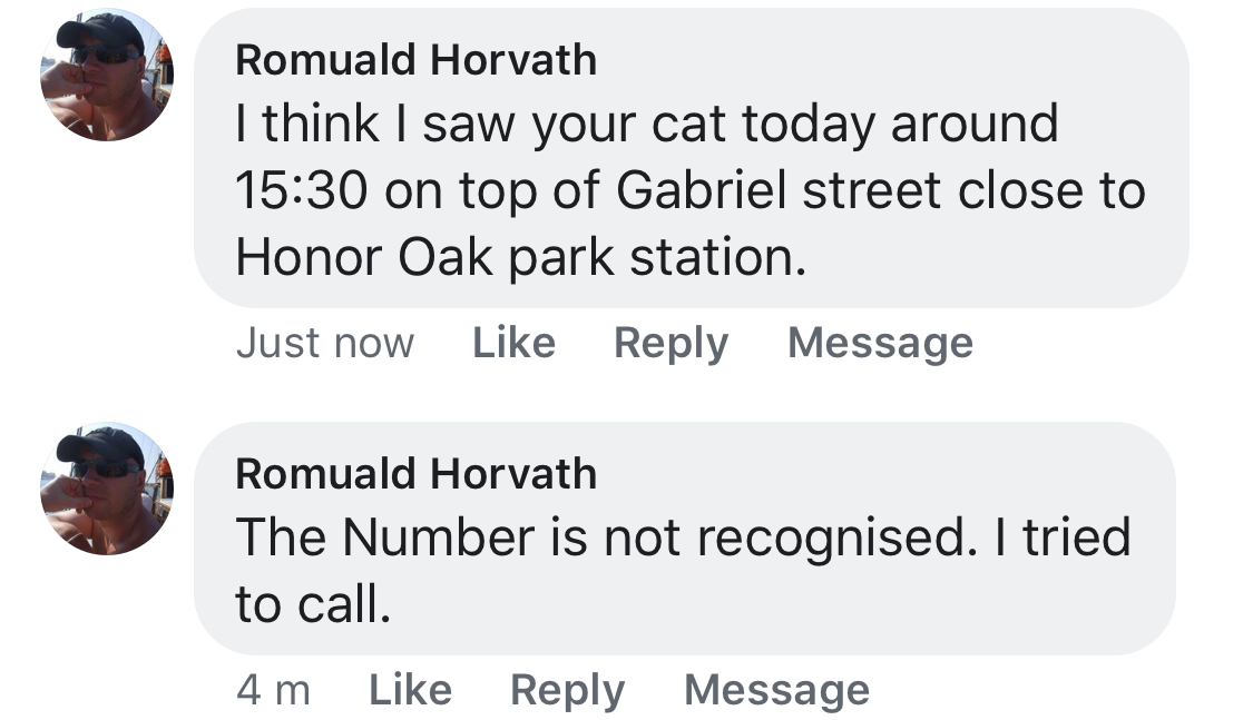I was worried when, earlier on in this thread, someone said he’d seen the cat near Honor Oak Park station and I thought he was totally lost with very little chance of finding his way home.