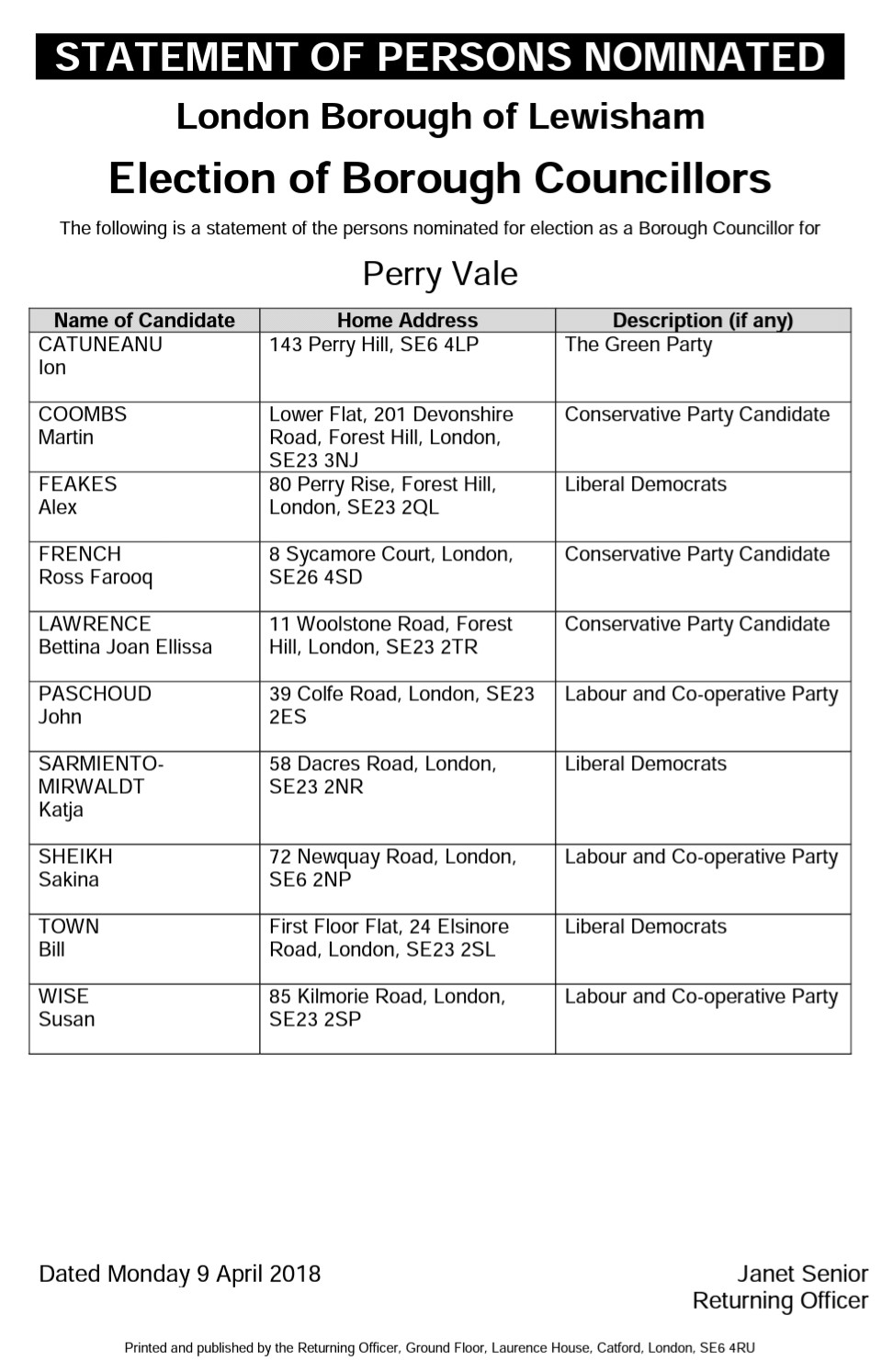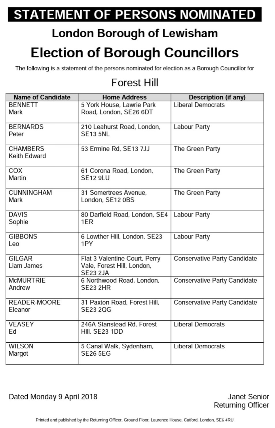 The following is a statement of the persons nominated for election as a Borough Councillor for Forest Hill Ward.