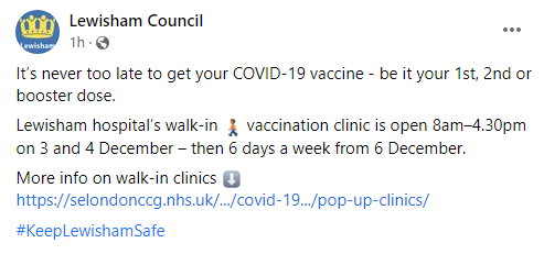 For anyone requiring a vaccine the vaccination centre at Lewisham Hospital has walk-in clinics today and tomorrow and then 6 days a week from Monday. It look’s like the criteria for boosters is still 6 months after the 2nd vaccine though, but with opening for 6 days a week from Monday maybe that will change.