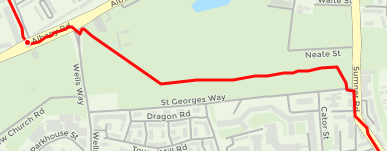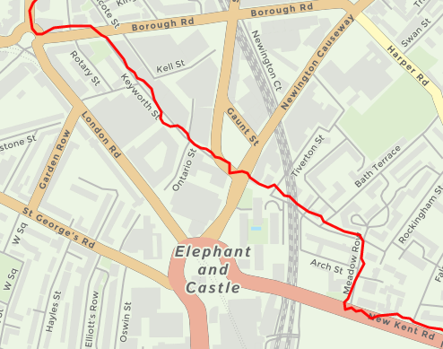 which is the best way to get to New Kent Road - where there is a bike path to traffic lights which will take you towards the N/S Cycle superhighway (sorry about the squiggly line - its an old commute for me, and back then the gps on my phone wasnt as good as the models these days)