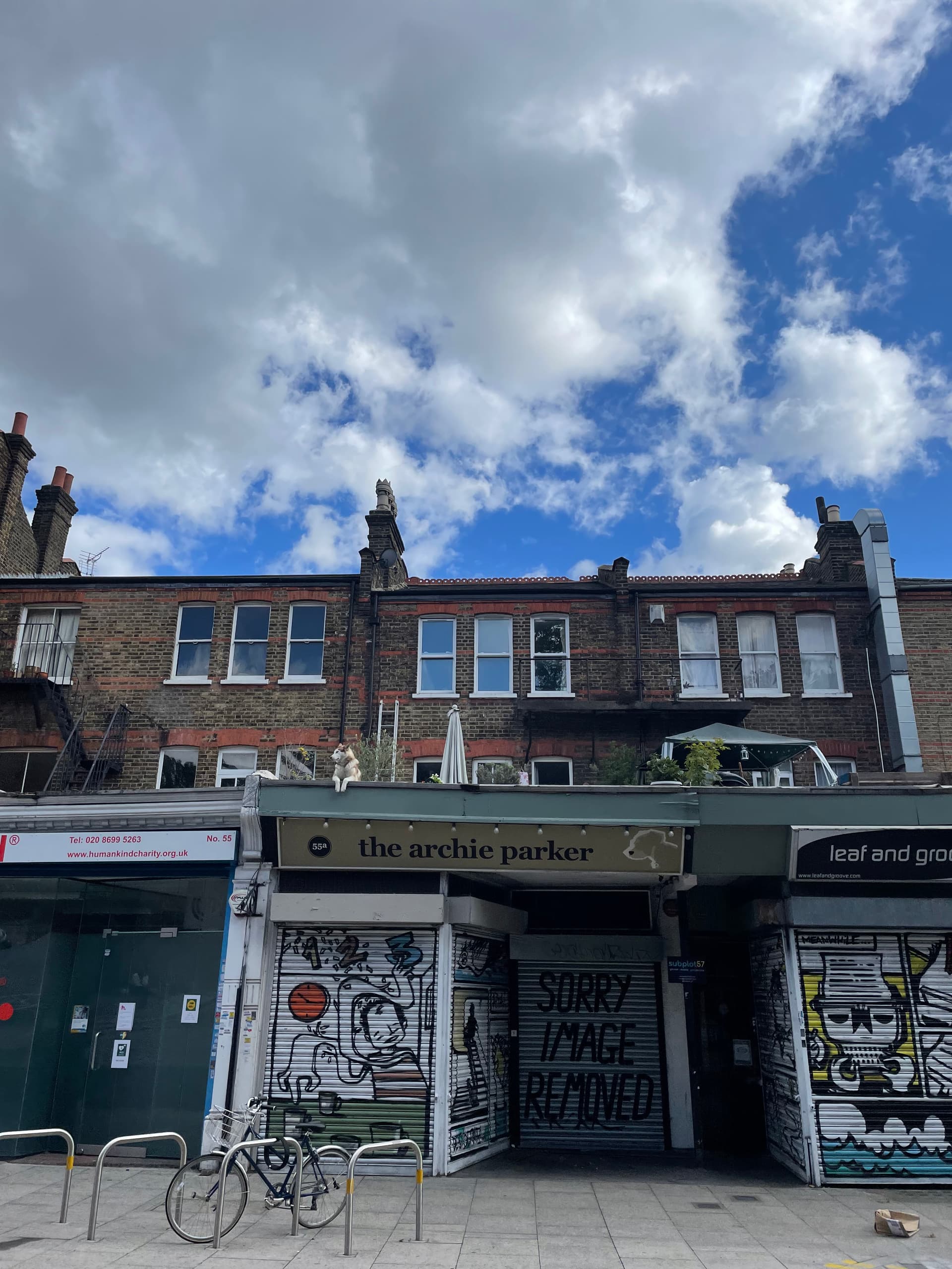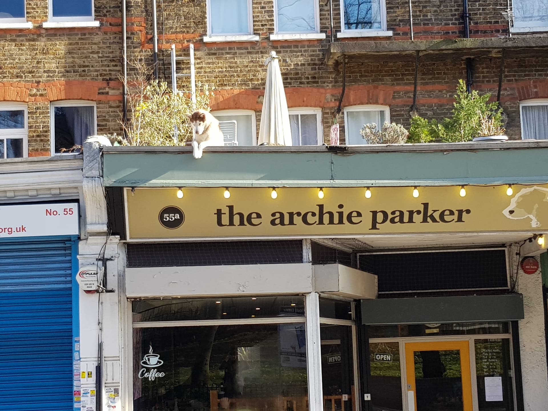 I love how The Archie Parker sign has a drawn dog on the right and this real dog seems to want to balance things out by always plotting-up on the left.