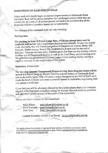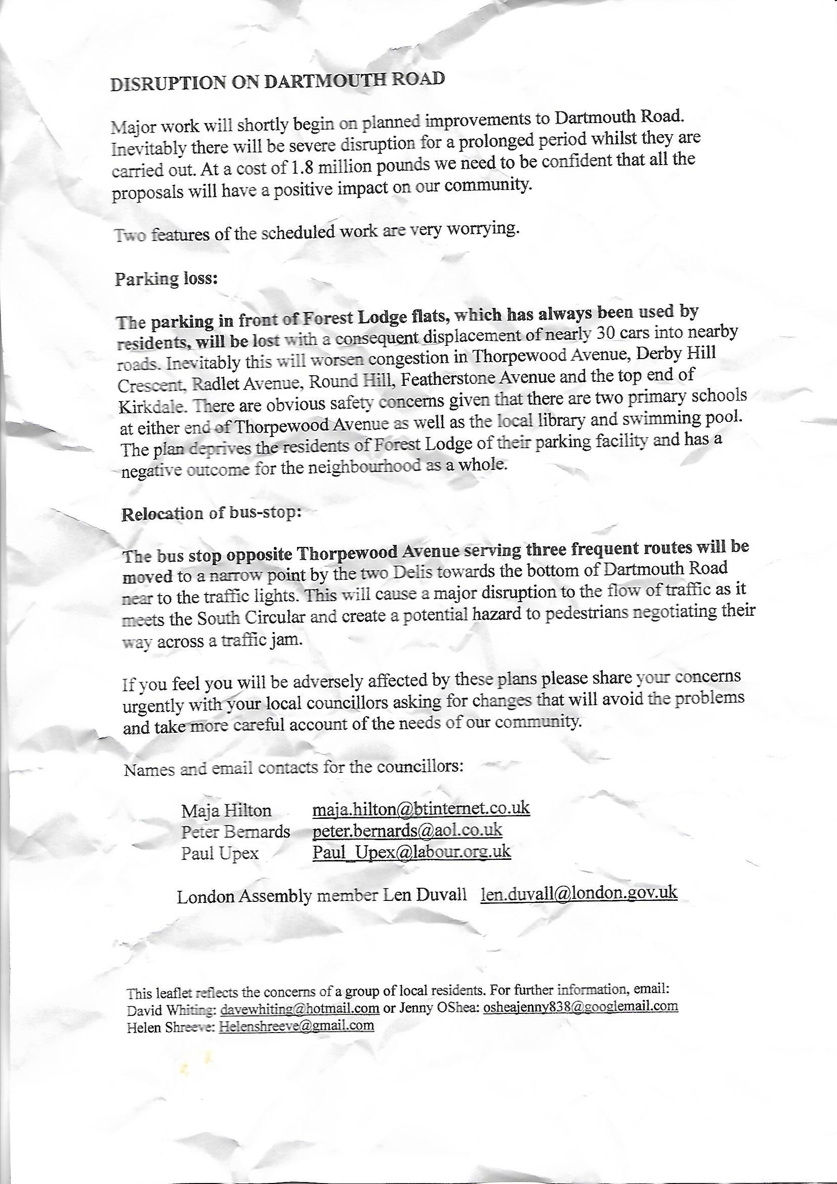 And ‘the bus stop opposite Thorpewood Avenue…will be moved to a narrow point by the two Delis [?} towards the bottom of Dartmouth Road near the traffic lights. This will cause a major disruption to the flow of traffic as it meets the South Circular and create a potential hazard to pedestrians negotiating their way across a traffic jam.’ I must say I hadn’t taken on board that the Thorpewood Avenue southbound stop was to be moved - I thought there was going to be an extra stop further north. (And what about the northbound Thorpewood Avenue stop?)
