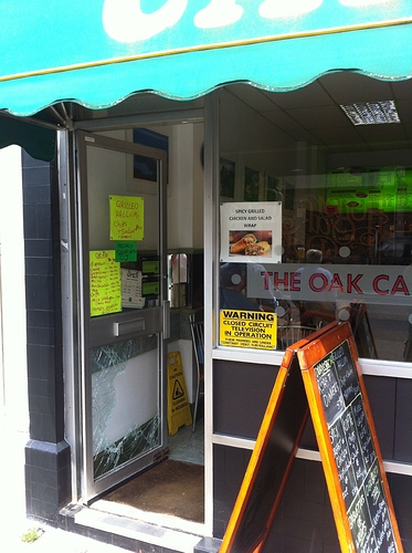 Both sites, which are opposite each other on Honor Oak Park, have had their door windows bricked. It may be just clumsy attempts at opportunistic theft (there was an unsuccessful attempt at theft in the cafe) or vandalism. Ugly, whatever the motive.