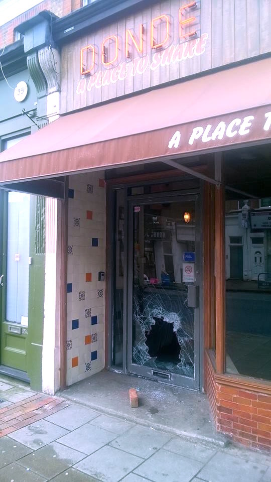 Both doors now fixed. Police still investigating, no suspects identified as yet, as far as Donde staff are aware. Similar attempted thefts via smashed door bottom windows in Stansted road a few months ago.