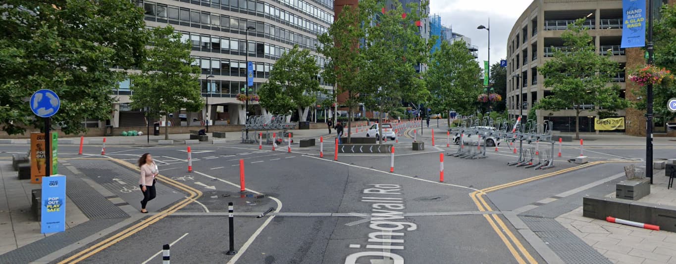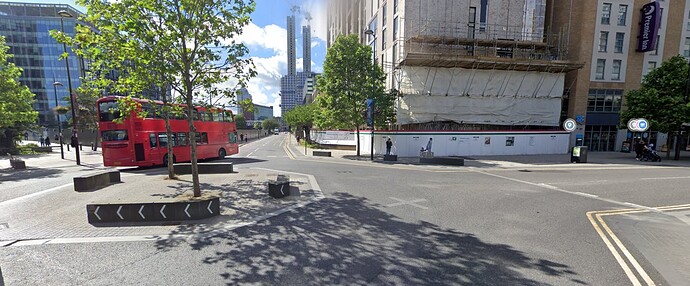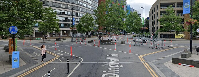 Some years ago the mini-roundabout at the back of East Croydon train station was flattened with kerbs removed in something that must have been inspired by the ‘shared space’ concept. It seemed ok to me (as a pedestrian) with road edges marked with tactile paving presumably for the visually impaired: