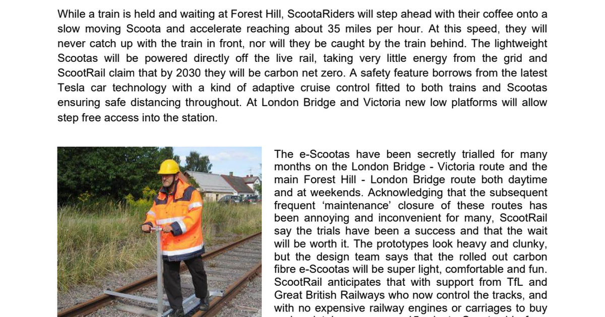 next gen e-scooters are to compete with the useless Southern Railway, with rail based ‘e-Scootas’ to use empty rail capacity. New company ScootRail says the carbon fibre Scootas will bypass all the traffic and bikes on the roads to give a trouble free and fun rail trip into the heart of the city. Details in Railway News here.