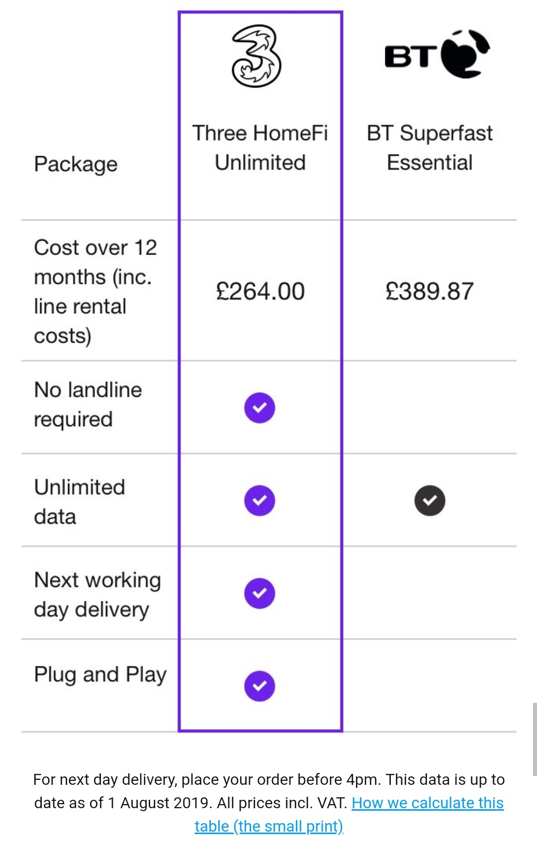 Three are marketing directly against BT Fibre with a comparison on their sales site, though I believe this comparison is still for 4G service at £22 a month and the BT fibre would actually be cheaper than the £35 a month price in the Engadget article and based on this comparison: