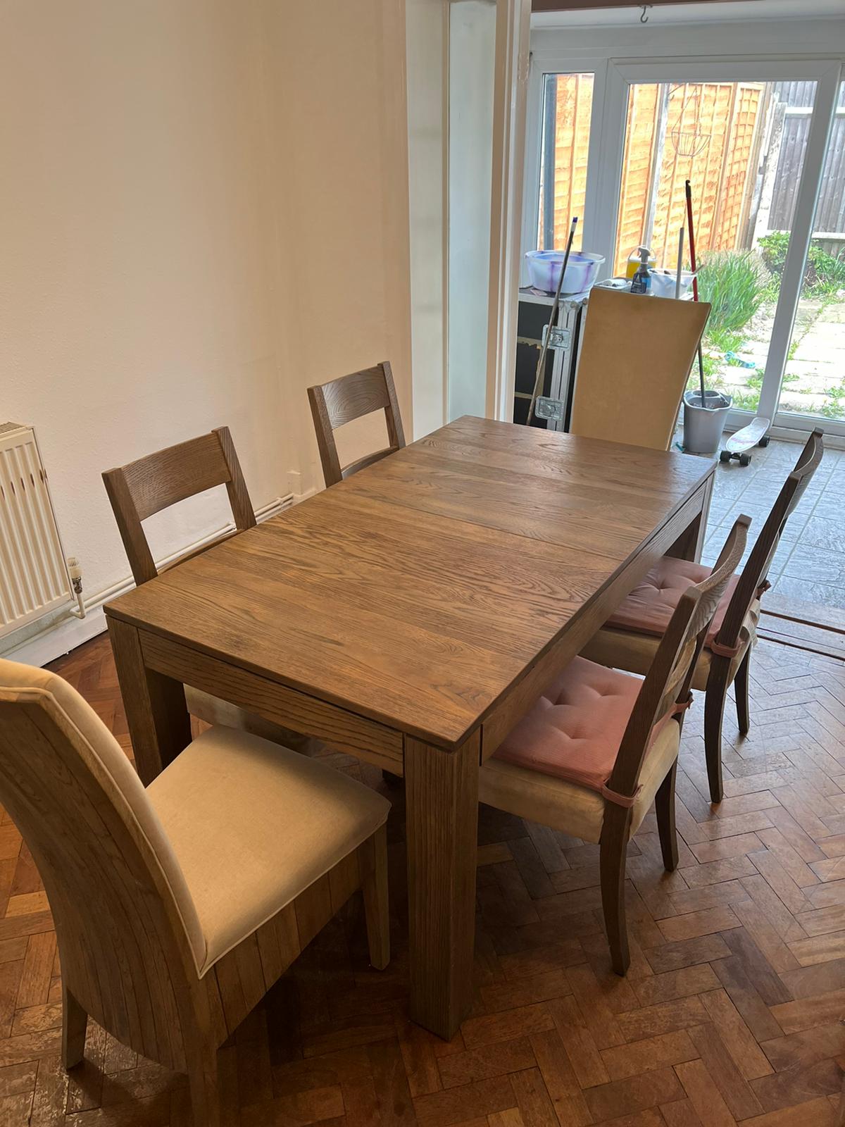 Item 1: Extendable wooden dining table and set of 8 chairs: £200