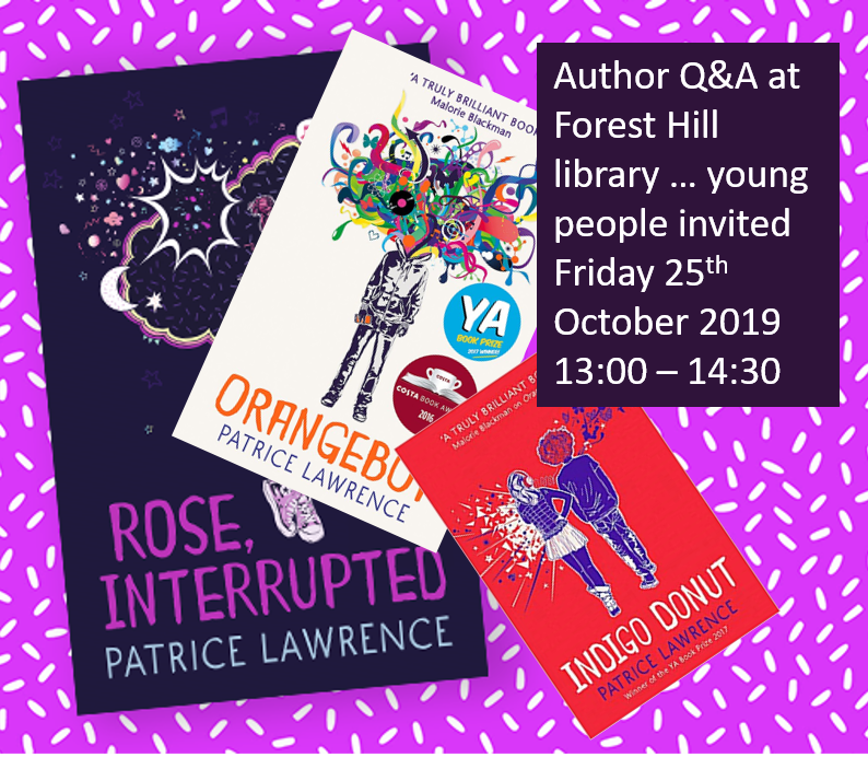 A talk by Patrice Lawrence – Patrice is an award-winning writer, whose debut YA novel, Orangeboy, won the Bookseller YA Prize and the Waterstones Prize for Older Children’s Fiction, and was shortlisted for the Costa Children’s Book Award and many regional awards. Indigo Donut, her second book, was shortlisted for the Bookseller YA Prize, was Book of the Week in The Times, The Sunday Times and The Observer, and was one of The Times’ top children’s books in 2017. Both books have been nominated for the Carnegie Award.