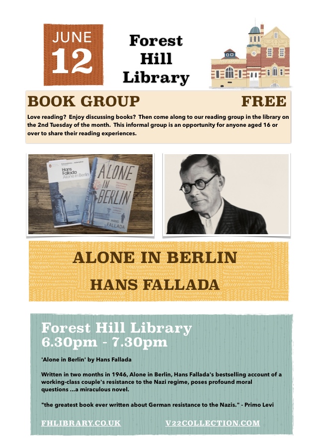 FREE: Join our Book Group on 12th June from 6.30pm to 7.30pm on the sofas in the Main Library, where we will be discussing ‘Alone in Berlin’ by Hans Fallada