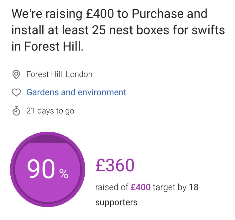 On a very positive note Lewisham Homes have agreed to let us put up swift boxes on any of their suitable buildings and Breyer Group will be installing them. This is great to hopefully help boost the numbers of this beautiful bird in our locality and protect our communities biodiversity. I’ve set up a crowdfunding page to help raise money to fund the boxes. If anyone could donate or help spread the message to make it a success, this the link to the crowdfunding page