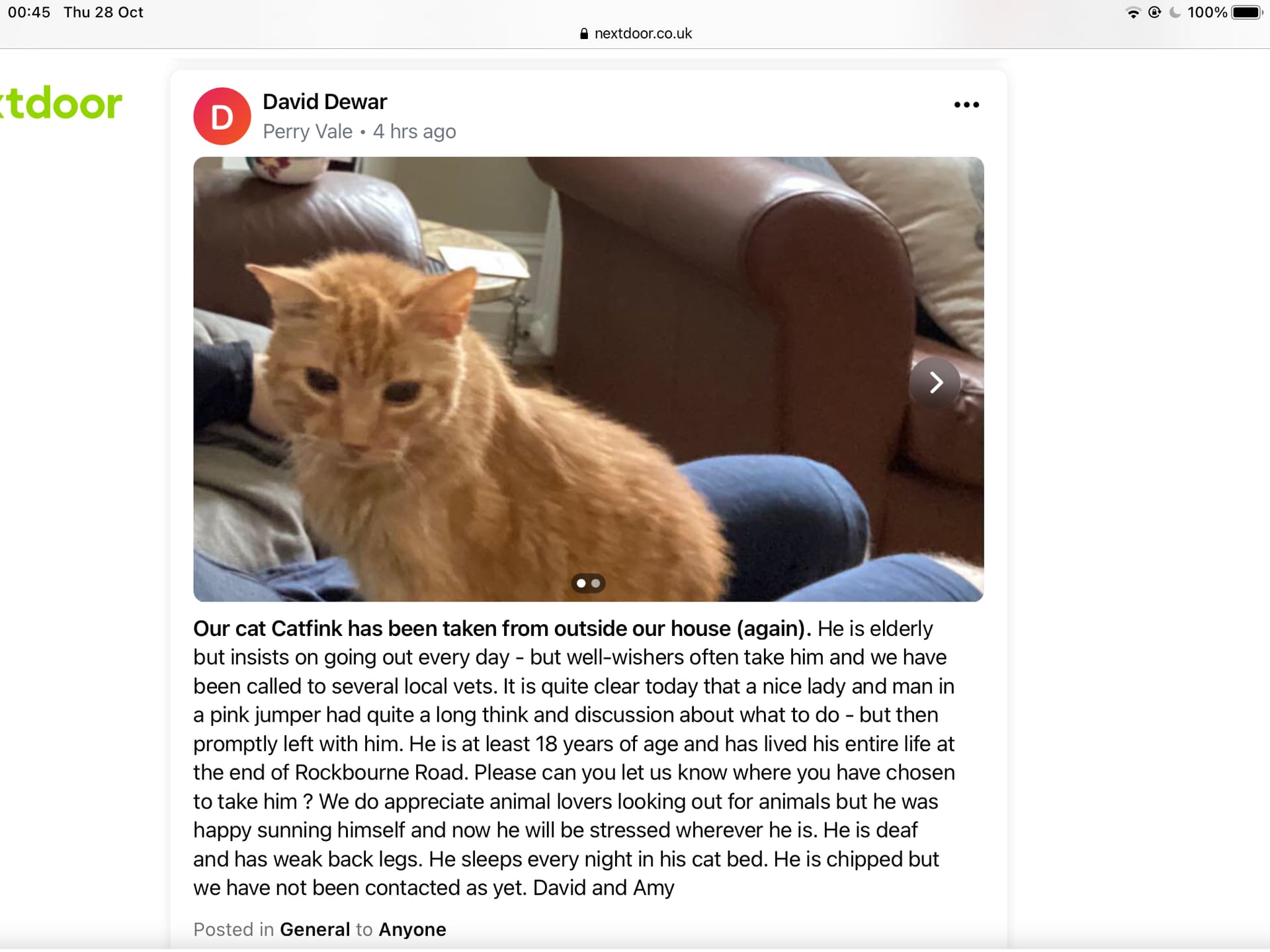 Poor old Catfink has been taken again by some doubtless well-meaning people. Sharing a screenshot from next door.com. Hope someone can bring him home.