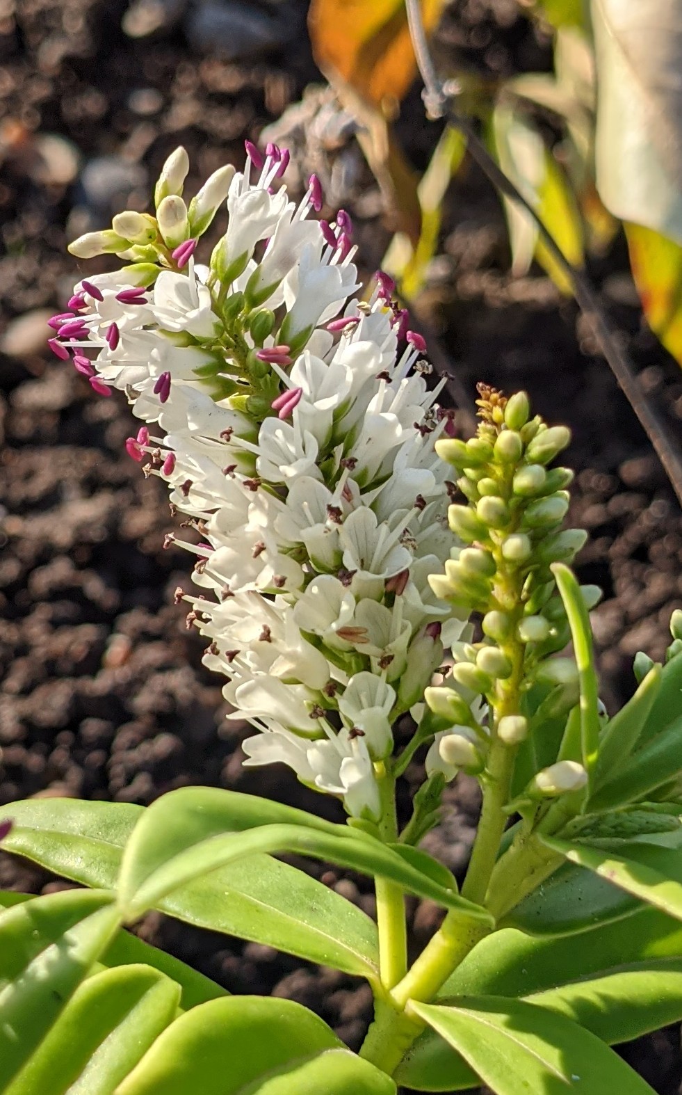 Hebe. Most stopped but this is one I grew from cuttings and planted out a few month ago, so it’s flowering for the first time now. The other 5 ones from cuttings I planted out later and no flowers.
