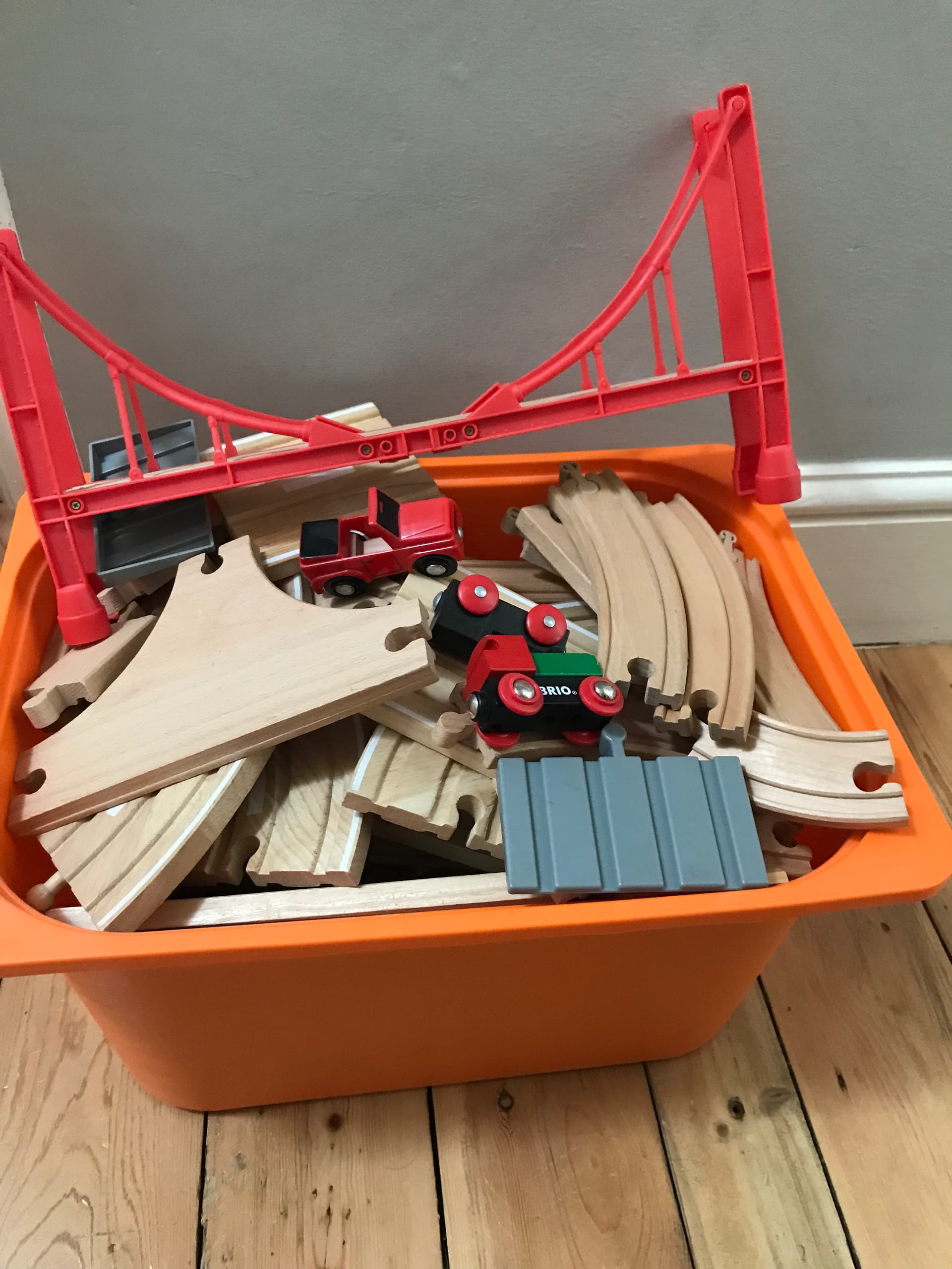 Large amount of wooden train tracks and trains. Includes bridge. (Tub not included) offers welcome.