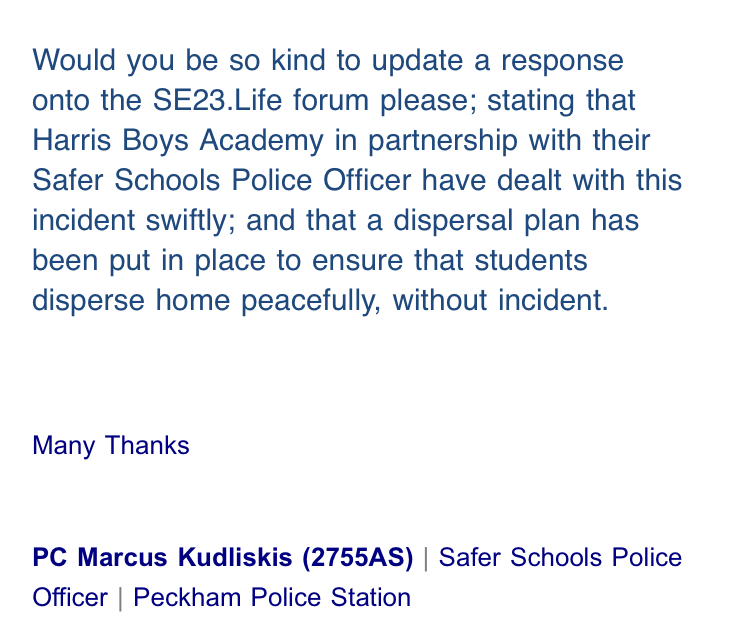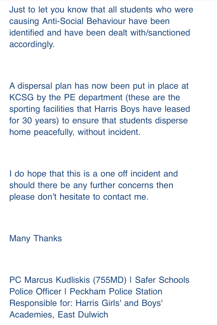 I live on Gladiator Street and saw and heard a big group of boys on brockley rise yesterday at that time with the Harris uniform on causing a commotion but missed what happened.