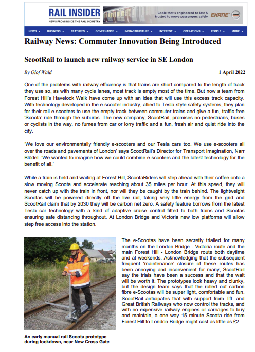 Rail Insider news reports that new high tech e-scooter services from ScootRail are to go head to head with Southern Railways. The new ‘e-Scoota’ service could halve the cost of a one way trip to Victoria or London Bridge.