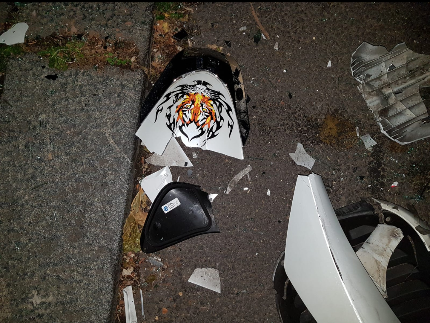 After hearing a crash about 22:45 last night we looked out the window to see a moped driver had not only crashed into the back of my husbands car but it looked like the driver had gone through his back window screen.