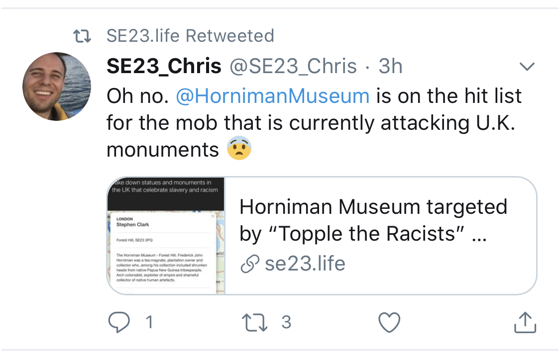 Concerned to discover the activists threatening historical monuments in the U.K. have added @HornimanMuseum to the hit list: