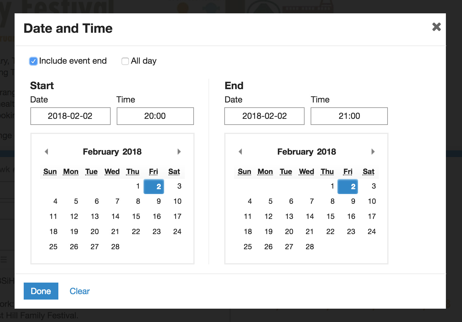 2. Click to set the dates and times. If times aren’t relevant, tick “All day”: