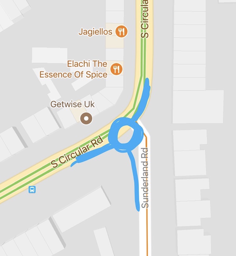 But like others have described so eloquently, I can’t see how this particular proposal would work. As noted by @Michael and @RachaelDunlop Sunderland Road’s junction with the South Circular and Perryvale are particularly troublesome. One could argue for lights at either end, but traffic on the South Circular through that bend is already often at a standstill. Would this further exaggerate the problem?