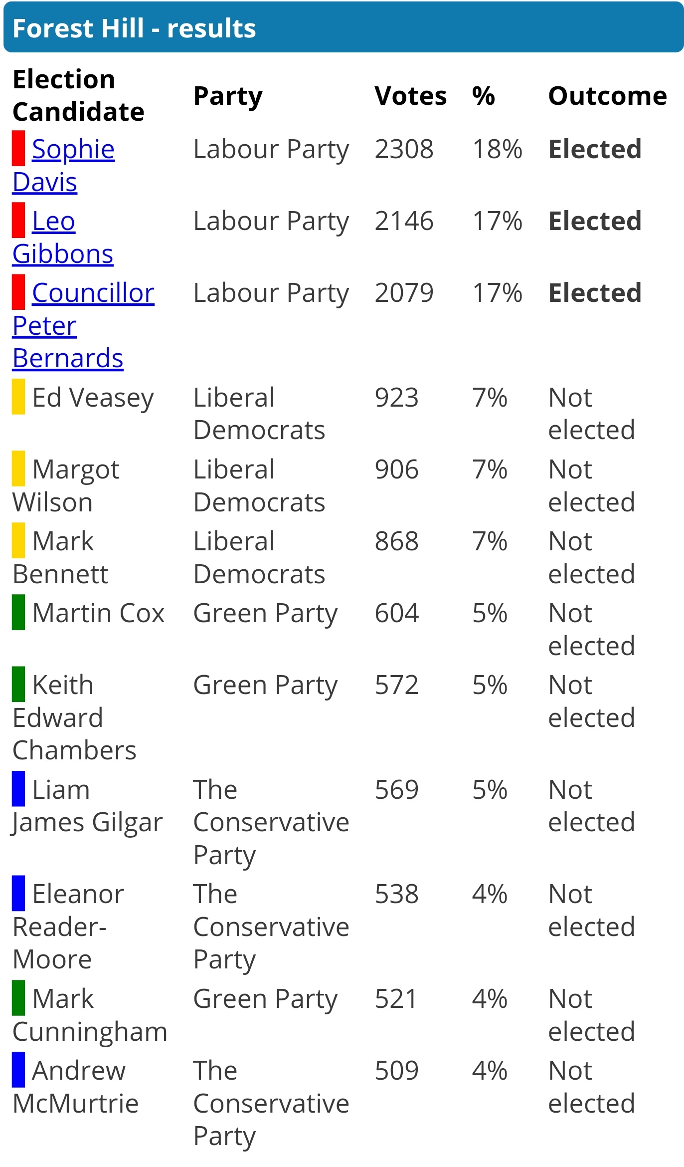 In 2018, if all the Lib Dem votes could have been consolidated under a single LD candidate in Forest Hill, they would have beaten everyone else and got a Councillor with 2697 votes: