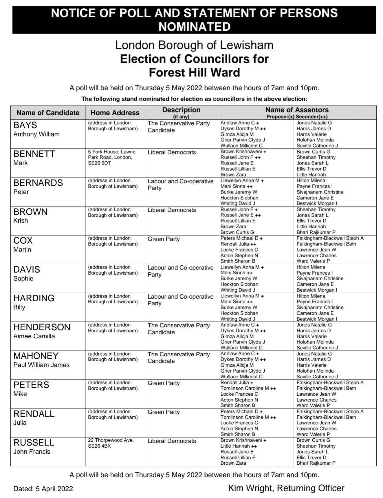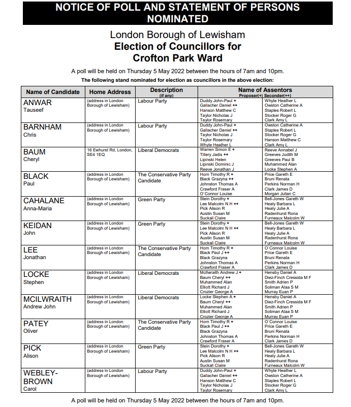 Here is the Crofton Park list of candidates for thos in HOP: