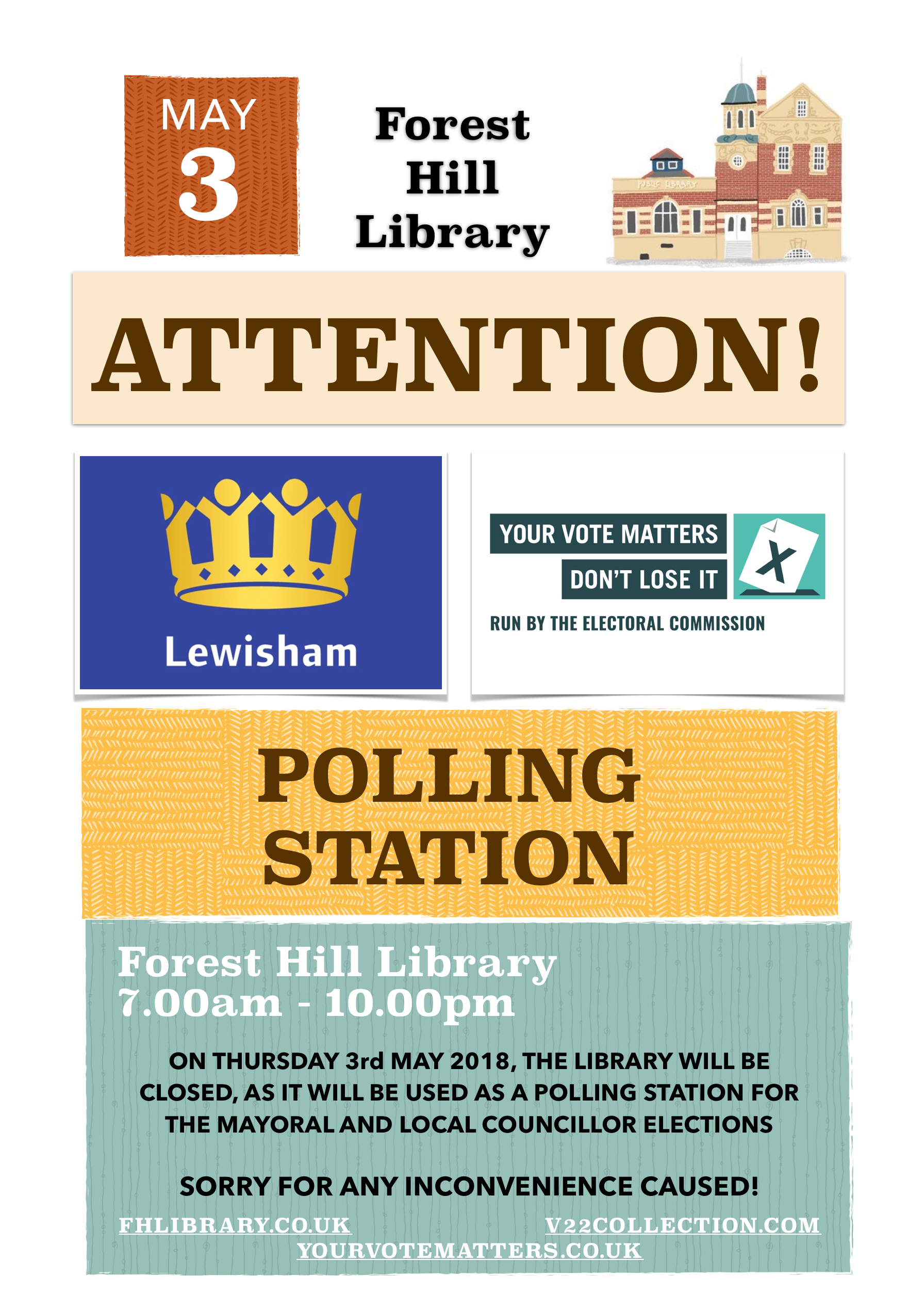 BREAKING NEWS! Forest Hill Library will be closed all day on Thursday 3rd May due to the Library being used as the local Polling Station for the Mayoral and Local Councillor Elections from 7am til 10pm. SORRY FOR ANY INCONVENIENCE CAUSED! buff.ly/2HChUru