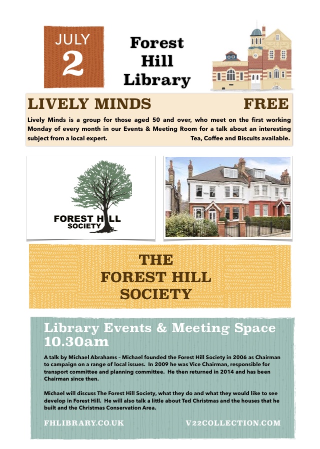 FREE: Lively Minds - Michael Abrahams @mjxa discusses ‘The Forest Hill Society, Christmas Conservation Area and many other topics’ at our Lively Minds Group on 2nd July from 10.30am. LOCATION: Events & Meeting Space, in the Library.