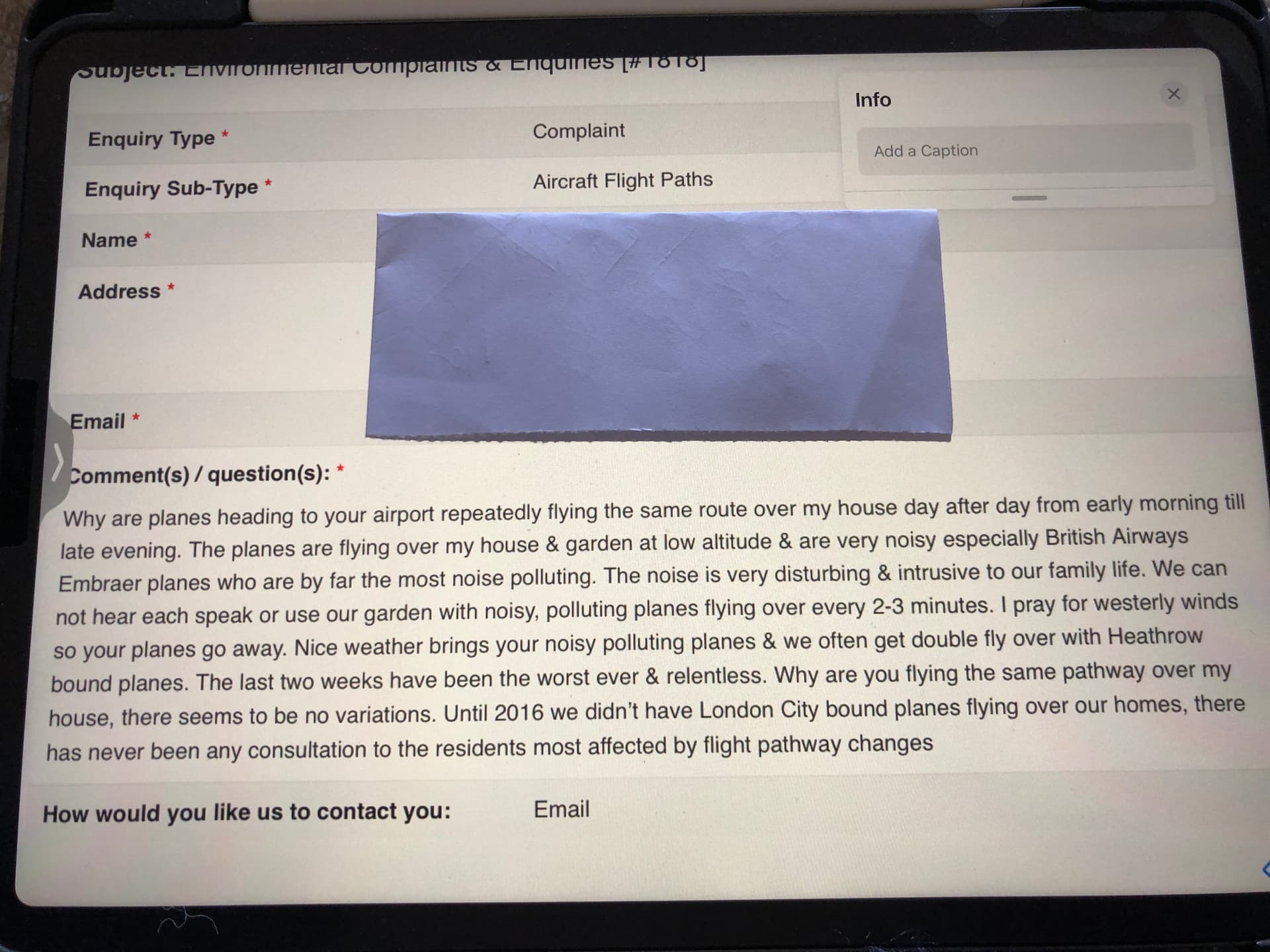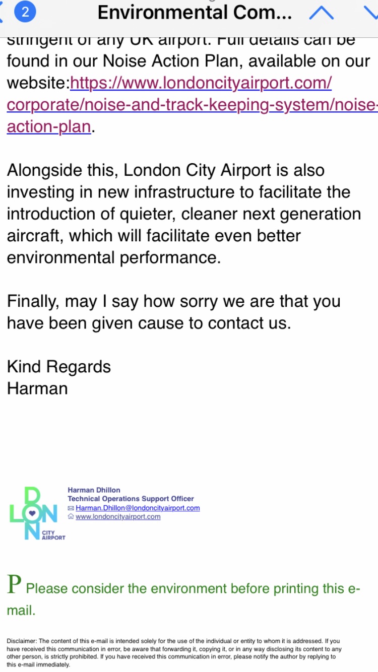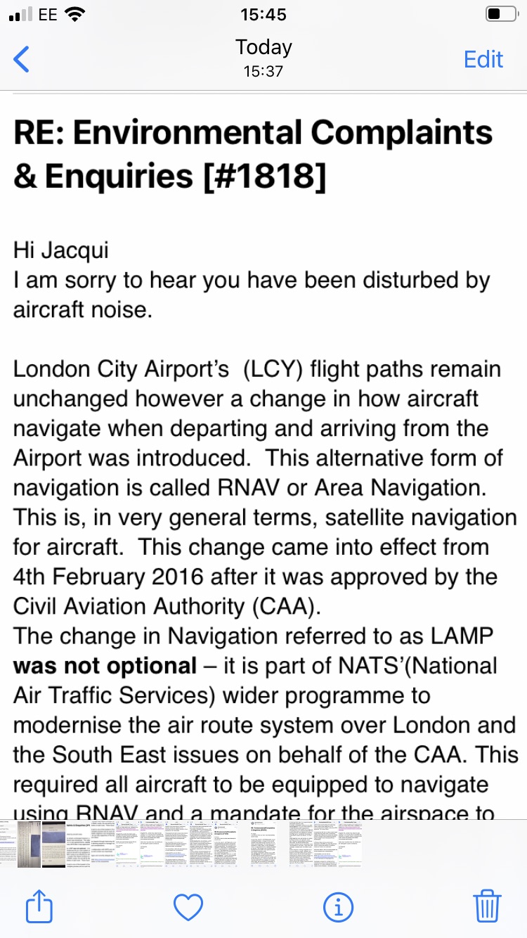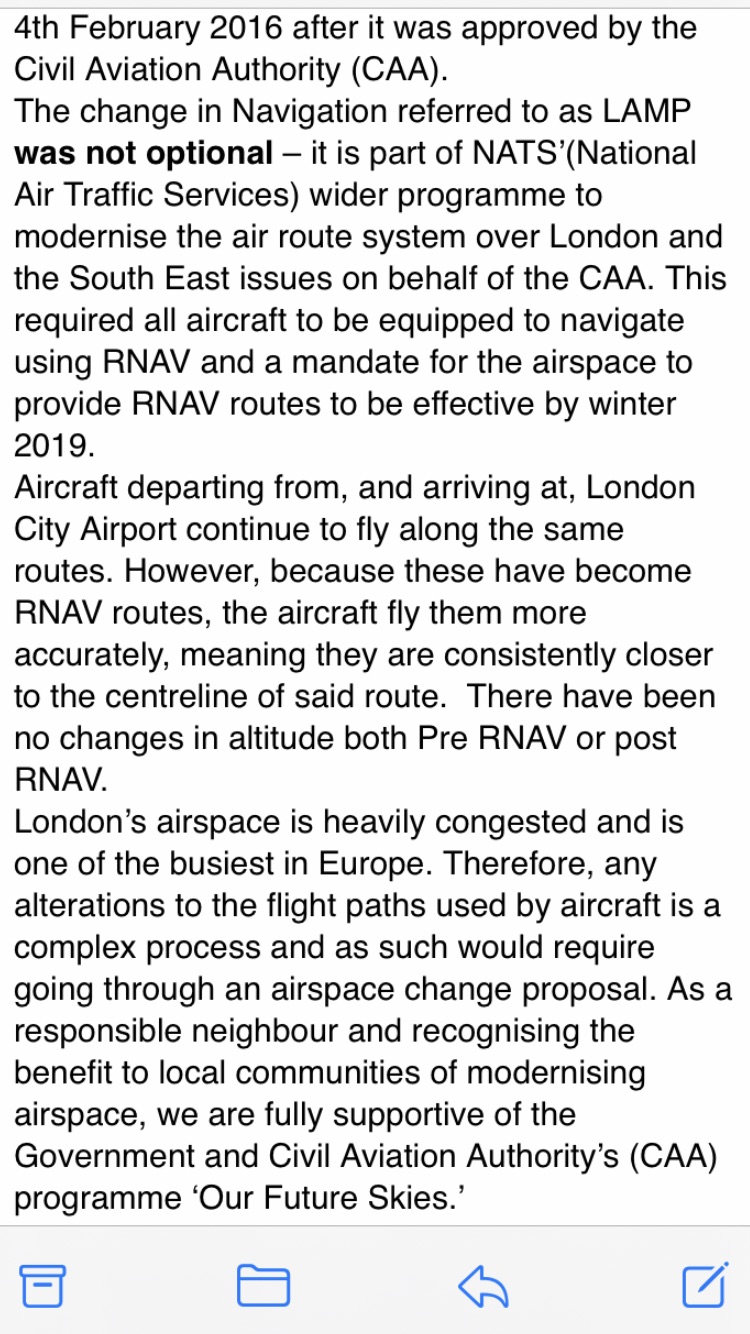 This is the reply I received this morning from London City Airport to my complaint about noisy flight pathways. Not the usual reply. Sorry it not the best way to send but could only use photos.