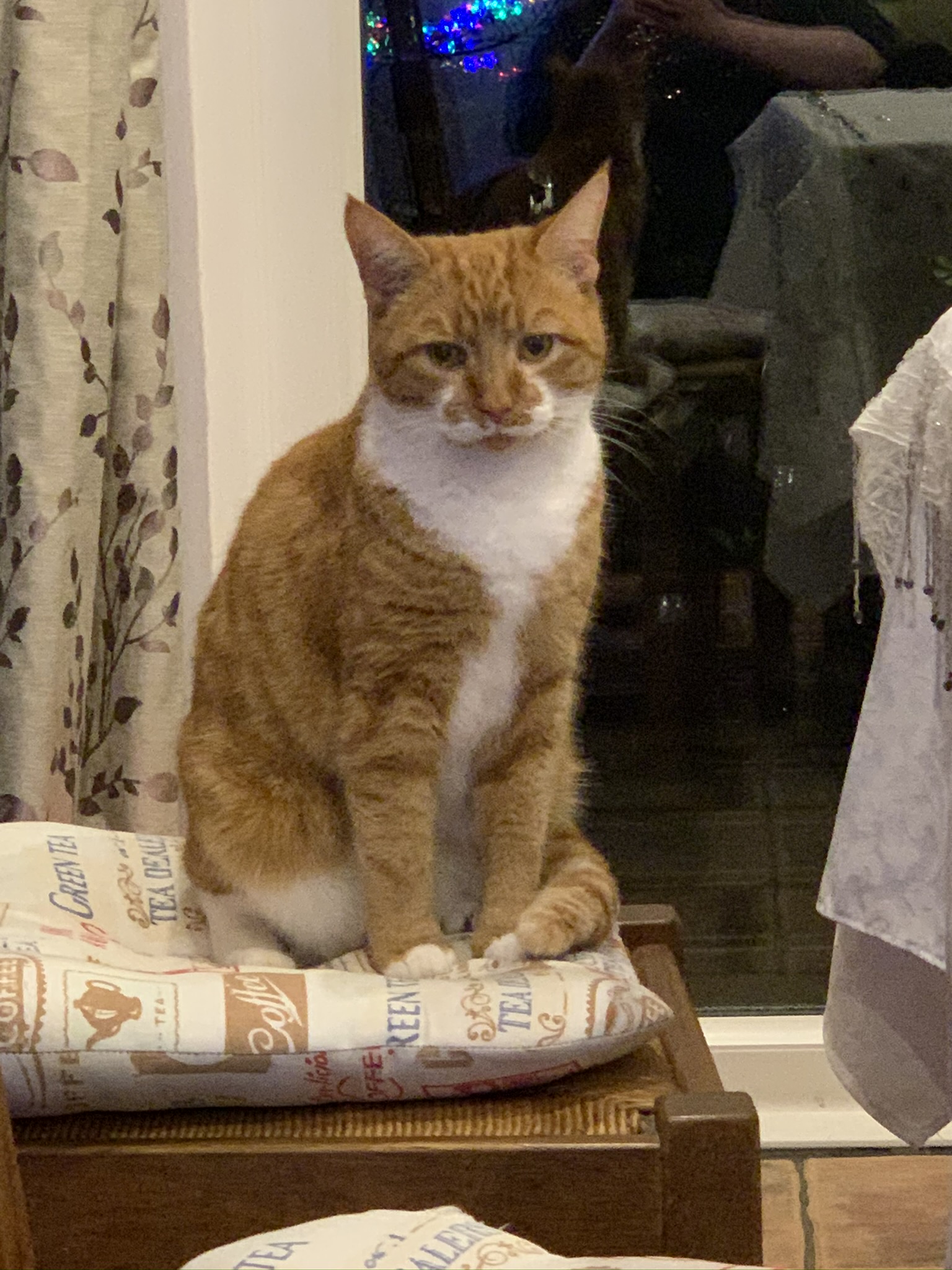 Her name is Penny. She’s a 2 year old ginger & white tabby with amber eye, a ginger patch on her back right leg and cream/ginger rings around her tail.