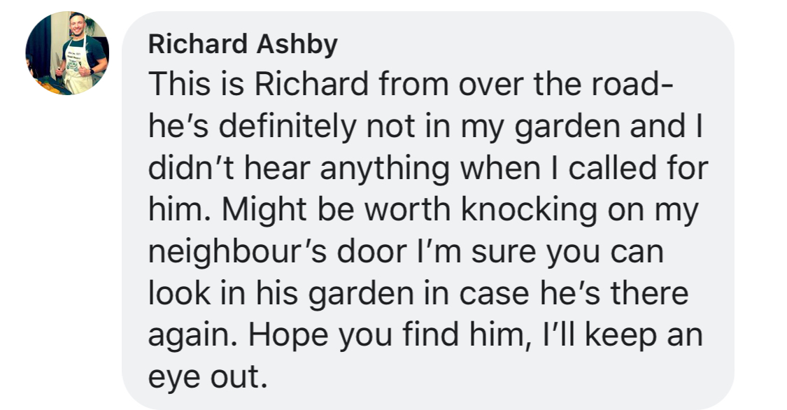 When their cat in a neighbouring road went missing for quite a few weeks, they put posters through all the doors, as well as posters on lamp posts etc. But I’m assuming you have already done this?
