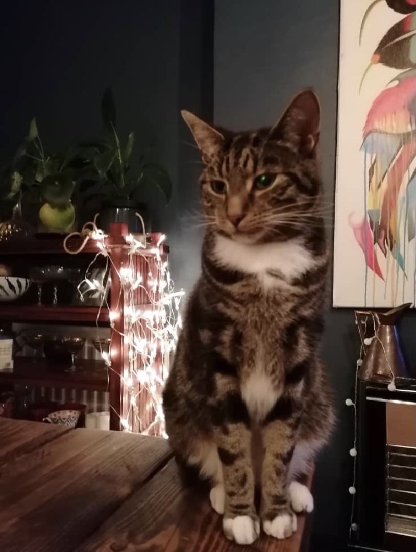 He’s quite distinctive because he has strong Bengal like stripes, a white front, white paws and a white tip on the end of his tail. He’s very friendly and will stand on his hind legs for a stroke. If anyone has any sightings please do let me know.