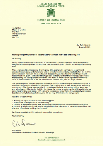 She has called for the Mayor to secure funding for repairs and commit to the long-term future of the 50m pool and listed building that houses it.