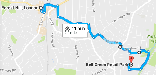 Unbelievably if you look at the road surface on Perry Rise it has cycles painted on it - indicating that its a cycle route - but you take your life in your hands if you go down there on a bike. However, even if you take the long way on a bike (along the waterlink way to Windsford Rd and then up Houston Rd) its still about 10 mins to Forest Hill and you are more likely to arrive alive (although you still have to battle the A205 if you want to go past the railway tracks). If you do go via Perry Rise on a bike (and survive) it is only 5mins.