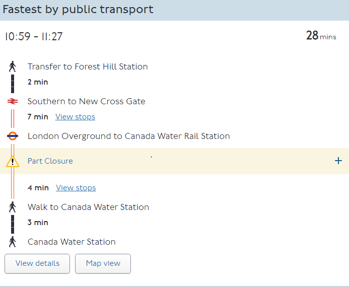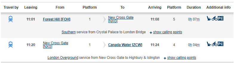 TFL journey planner and National Rail Enquires are also listing other options as well for Sunday! As the rail replacement buses from Forest Hill are only going to New Cross Gate and not through to London Bridge and there is another rail replacement bus service from New Cross Gate to London Overground stations it is quicker to get a bus to another rail station that is not on our line!