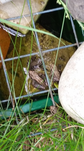 So here is ours, this is about 1/4 of the size so not big. I have a 2 year old and am \ was worried about having a pond (I filled in our pre-kid one ) and so on this one although it is very small I have a metal grate over it (I had it spare from one of those pop up greenhouses), with a heavy plant pot on top so it can’t be moved and some rocks which also provide cover for the frogs. I can sleep and the frog maybe get some extra protection. I’ve let the grass grow longer around it so they get some cover. Not very easy to see due to bad photo, but there are 4 frogs in there!