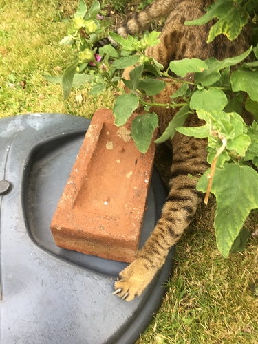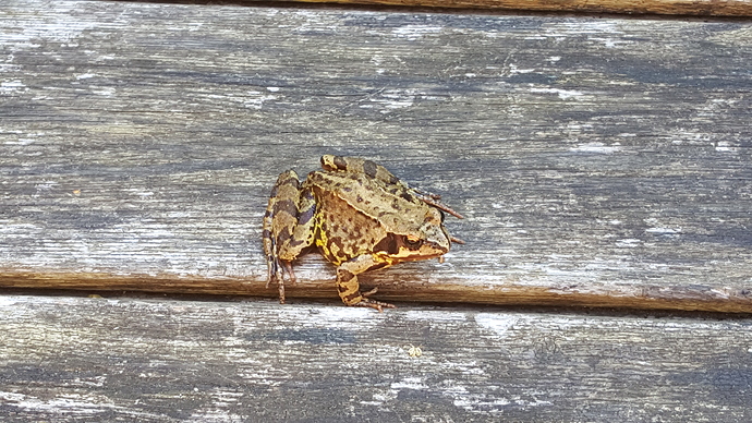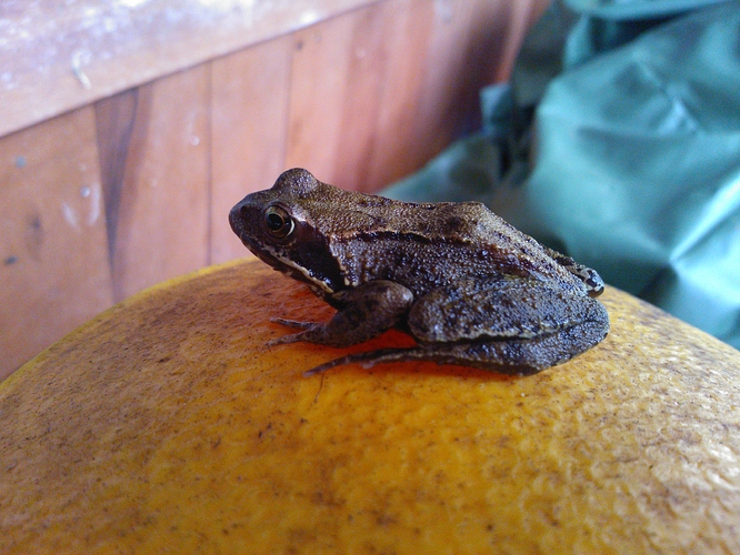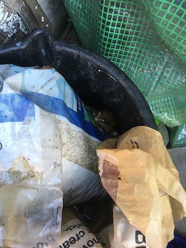 Unfortunately he was forced to become a refugee after being hunted by a cat and was evacuated after spending some 20 mins under bin lid protection due to the unwanted attentions of said cat who made every effort to prise the frog from its place of safety