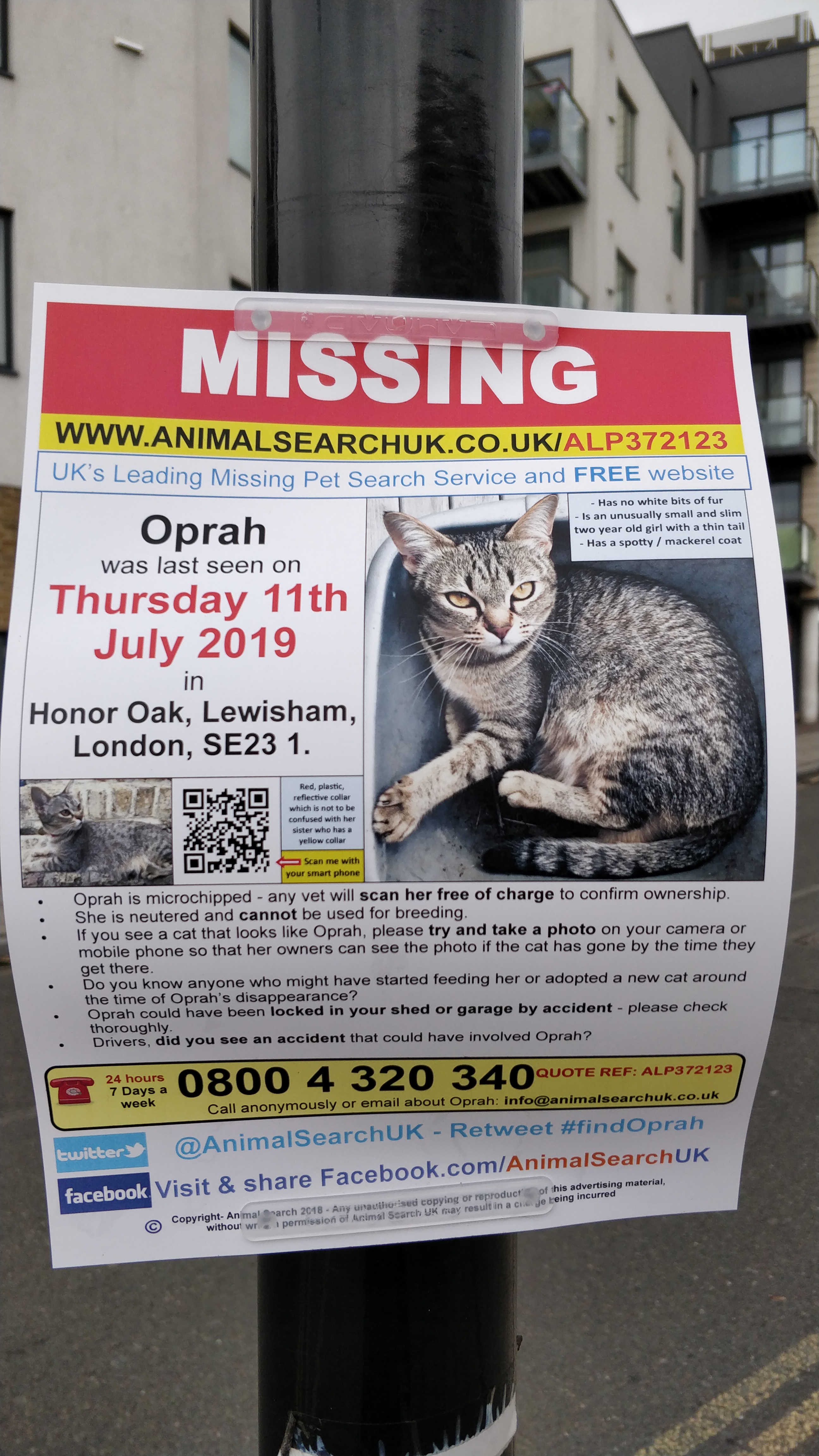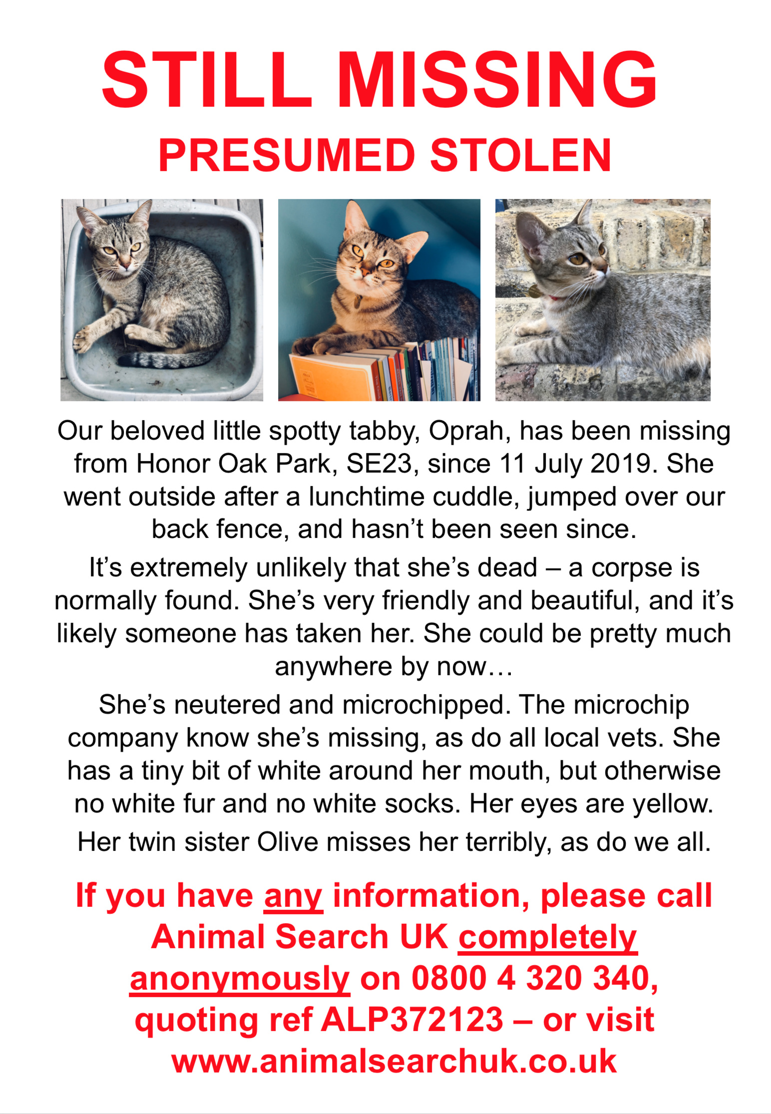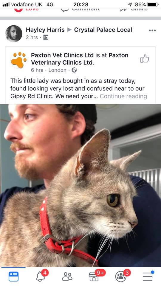 Hello - thank you so much @oakr - yes, I did see that while we were on our honeymoon - gave me a bit of a start as it does really look like her, but the FB post I saw said that cat was collected by her owners about 2 hours after that vet put the word out. Also Oprah is microchipped so any vet who found her would be able to contact us I hope…! But thank you for trying. It’s been nearly 8 weeks now, unbelievably, and we all still miss her like mad. It’s the not knowing that’s so awful. And poor Olive, Oprah’s sister, who is shouting at me as I type this! Thanks so much again though for thinking of us. Oprah is very definitely still missing and any help we can get is very gratefully received.