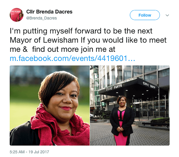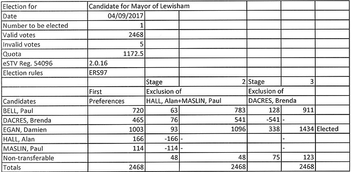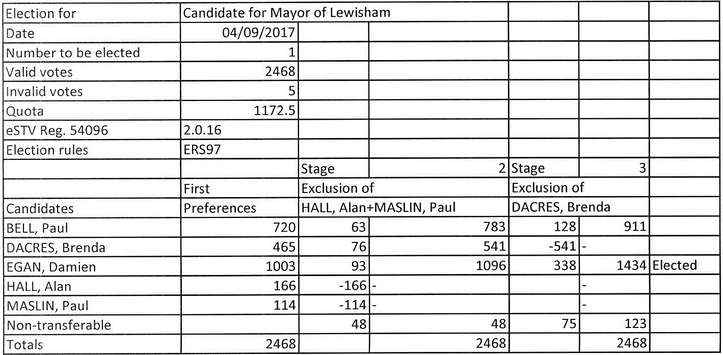 In May 2018 Lewisham voters will get two votes; a 1st and 2nd preference for their choice of mayor. A candidate needs 50% of the votes (plus 1) to win. If no candidate gets 50% in the first round all but two candidates are eliminated and the 2nd preference votes are redistributed to the top two candidates.