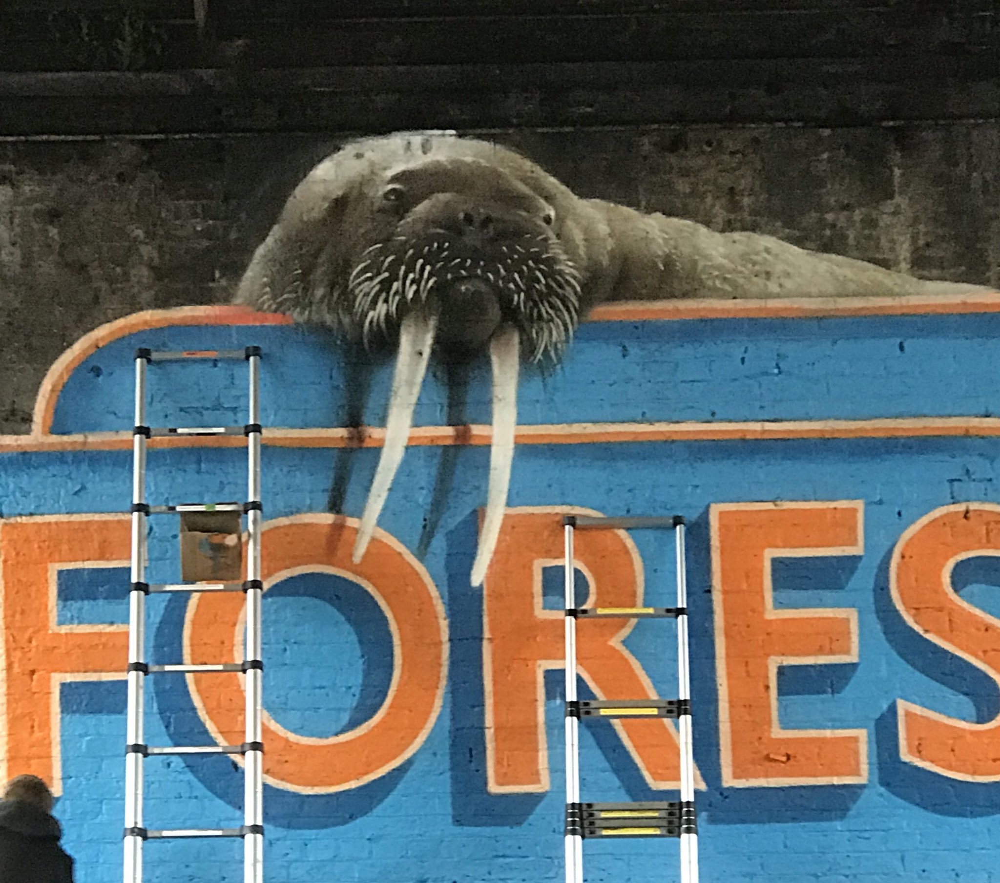 Here’s an interview with artist Owain Nicholls, who focussed on the walrussing of our mural, Owain was also responsible for the beautiful Catford butterflies