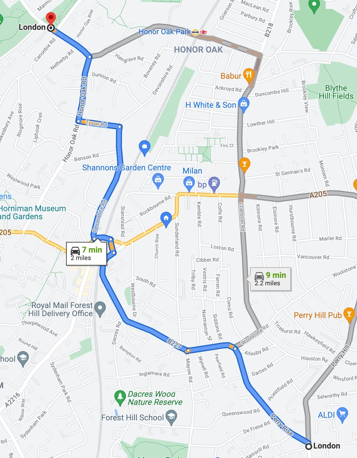 It’s a good route but you can probably shave off 10 seconds by using Westbourne Drive and Canonbie Road rather than the slow main roads and pesky zebra crossings. It is a particularly good route if you have 4 wheel drive so that you don’t need to slow down for humps.
