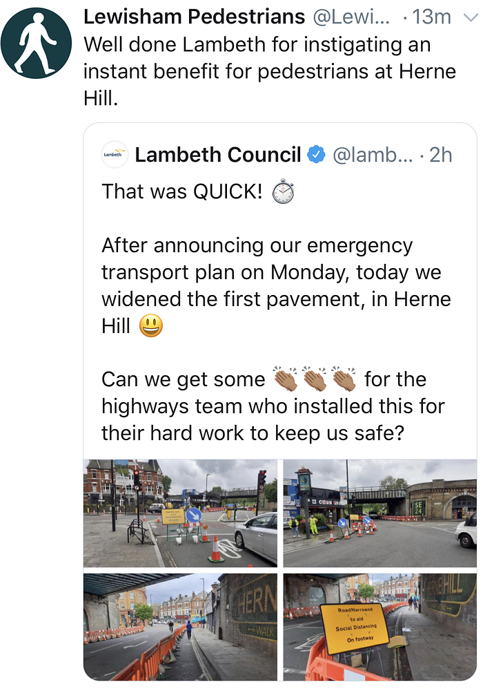 There’s too much talk in decision makers’ circles about pedestrians and cyclists as if their needs are the same and too much talk about “shared spaces”. They don’t work. Try walking along a busy canal towpath nowadays (even without the fear of Covid-19) or in parts of Peckham, to see how these shared spaces don’t work for pedestrians.