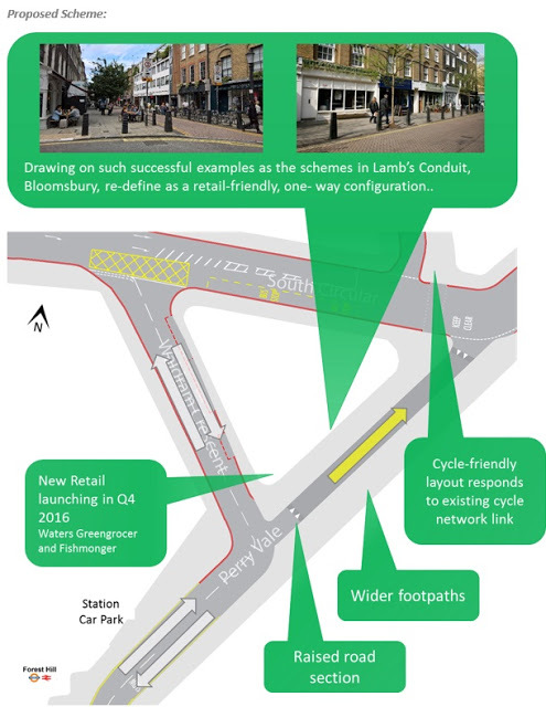 The aim is to regenerate this short stretch of road, the only road in Forest Hill with shops that is not on a bus route and main road, so it provides an opportunity that does not exist on Dartmouth or London Roads, if the pavement is widened a little.