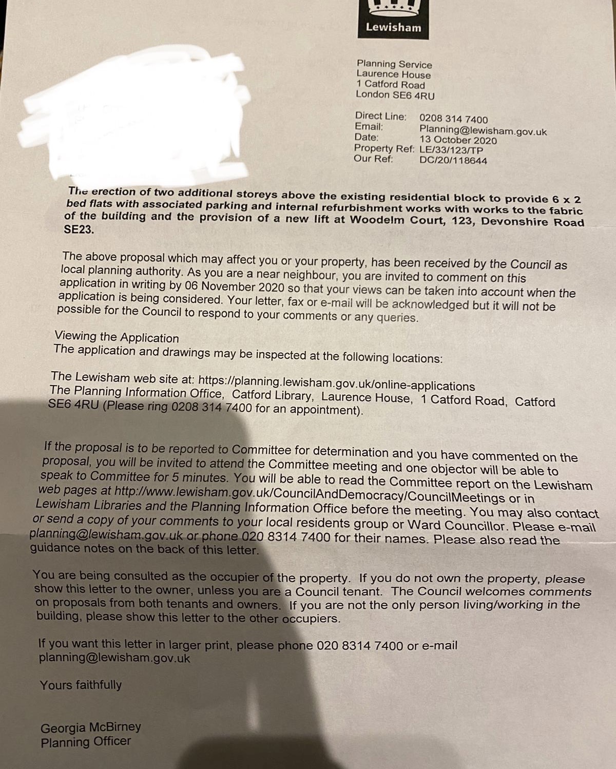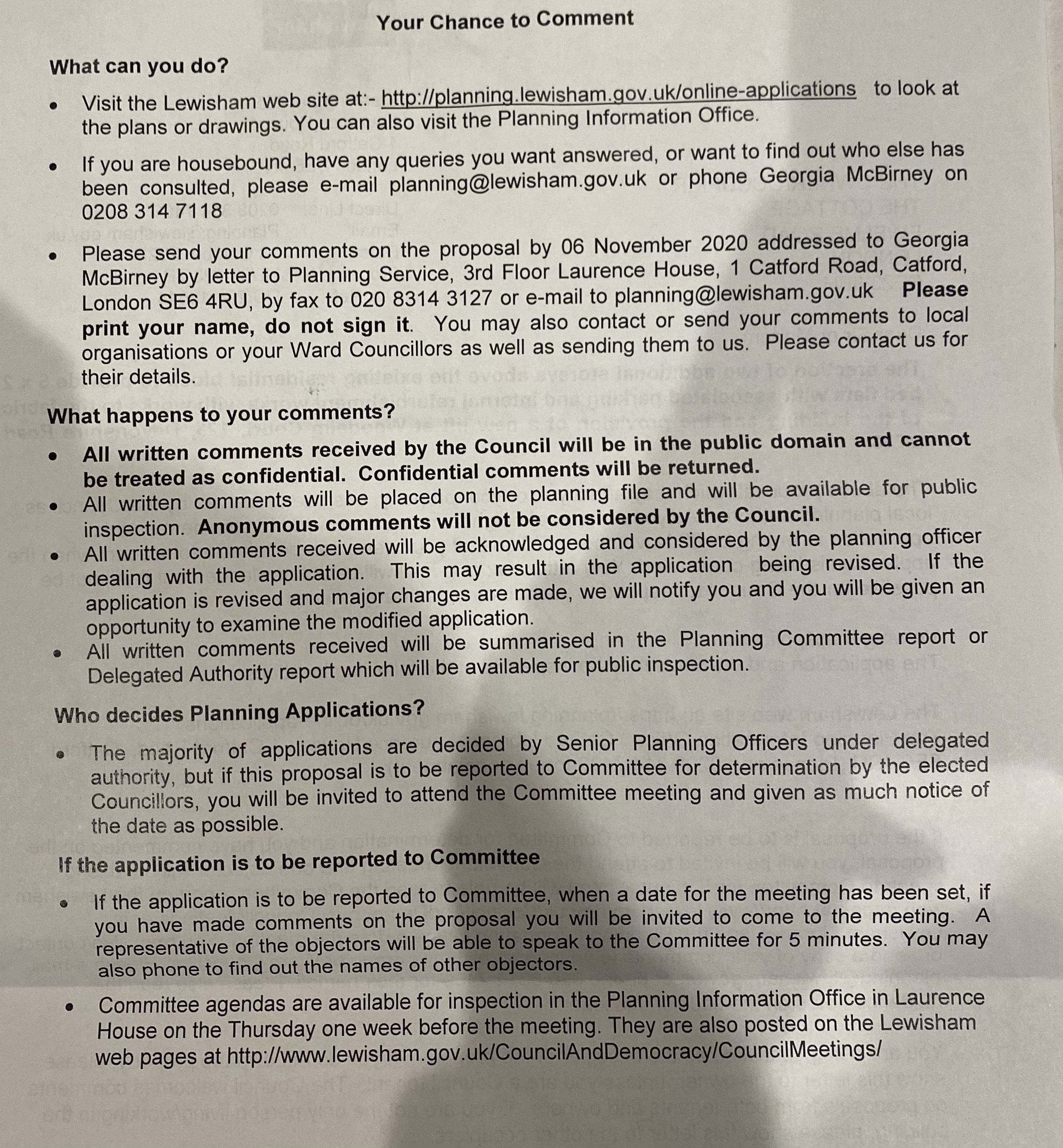 Has a site notice been displayed? If not, I’d suggest writing to Georgia.Mcbirney@lewisham.gov.uk (she’s the Case Officer) with a cc to planning@lewisham.gov.uk asking her to ensure a site notice is displayed. Officially you have 21 days to object (ie calendar days, not working days) from the display of the site notice, an ad in the local press or receipt of the letter informing you of the application, whichever is the latter. It also can’t hurt to tell Georgia now that you are objecting and that your full grounds for objection will follow.